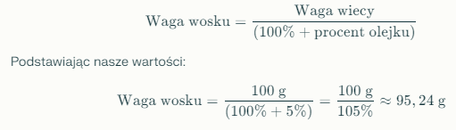 Załóżmy, że chcesz stworzyć świecę o wadze 200 g z 5% stężeniem olejku zapachowego. Obliczenia będą wyglądały następująco: