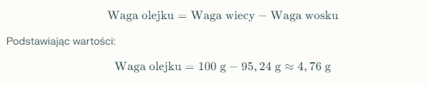 Następnie obliczamy wagę olejku zapachowego, odejmując wagę wosku od całkowitej wagi świecy: