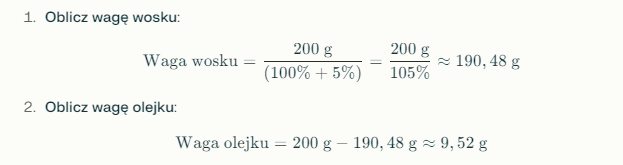 Załóżmy, że chcesz stworzyć świecę o wadze 200 g z 5% stężeniem olejku zapachowego. Obliczenia będą wyglądały następująco: