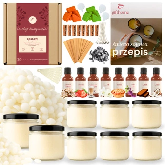 - Zestaw do robienia świec z wosku sojowego 8x235 ml to bardzo popularny zestaw w naszej ofercie - starannie dobrany pakiet wszystkich niezbędnych składników, który pozwala stworzyć aż osiem eleganckich świec zapachowych w stylowych, przeźroczystych słoikach szklanych. To idealne rozwiązanie dla osób, które chcą poważnie zająć się świeczkarstwem, stworzyć dużą kolekcję zapachową lub przygotować wiele prezentów na raz.