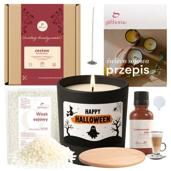 Zestaw do robienia świecy na Halloween CZARNY POJEMNIK z naklejką i drewnianym wieczkiem PREZENT, URODZINY
