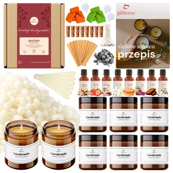 - Zestaw gotowych produktów potrzebnych do produkcji świec sojowych to doskonała propozycja dla osób początkujących.